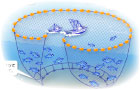 40トン以上の大きな漁船で、大型の網を円形に広げて、泳ぎ回る魚を群ごとすばやく包囲して獲る漁法です。群を網で囲むと、網の底をしぼって囲みを小さくします。