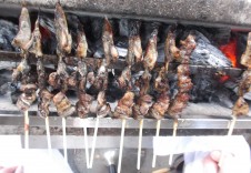 魚殿では、背開きにしたどじょうを3、4つに切って竹串に刺して店頭で炭火を用い