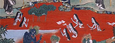 両者に決まって描かれる共通の内容は、まず佐伯有頼の開山縁起です。熊を追う姿や、阿弥陀を拝する姿が描かれます。