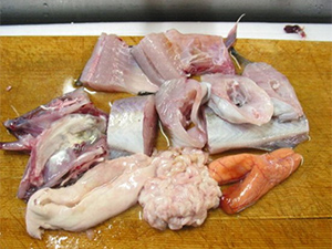 沸騰したお湯の中にタラの切り身を1~2個ずつ入れて、表面が白っぽくなったら、すぐに水に入れます。これで臭いが無くなり、表面がコーティングされ旨味がとじこめられます。