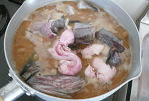 下処理(鱗取り、ぶつ切り、血合い取り)をして、湯通しをします。