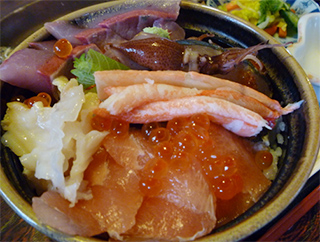 更に素材の持ついろどり、たとえば、赤(マグロ、甘エビ、カニ、赤貝)、黄色(ウニ、出汁巻き卵)、オレンジ(サーモン、イクラ)、白(イカ、ヒラメ、スズキ)、薄青(サヨリ、あじ、コハダ)、銀(太刀魚)、茶色(タコ、ホタルイカ)、緑(きゅうり、大葉)・・・これらをカラフルに組み合わせた「いろどり丼」が楽しめます。