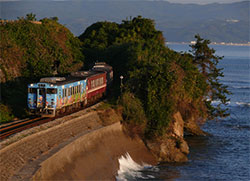 <海岸沿いを走るJR氷見線:ブルーの先頭列車は