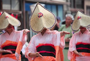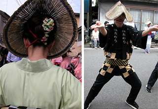 踊り手の衣装のデザインや色は、各町によって大きく異なりますが、男性・女性ともに、編笠を深く被るのが特徴です。