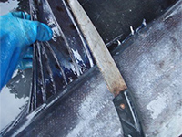 まず、体表をタワシでこすり、屏風のような背びれをノコギリで切取ります。(包丁では歯が立ちません)