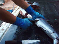 頭とハラミを切り取ります。頭からはカマだけキープし、ハラミの皮を引いてサクに切り分けます。