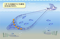 漁獲物:エビ、カニ、イカ、タイ、ヒラメ、カレイなど海底にいる魚種。