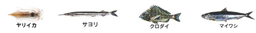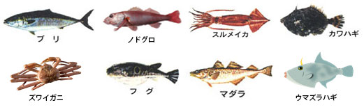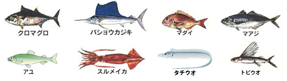 フクラギ、アオリイカ、キジハタ、カマス、シイラ、ワタリガニ、サケ、ニギス